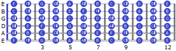 Aquí te dejo un dibujo del diapasón de la guitarra con todas las notas hasta el traste 12.